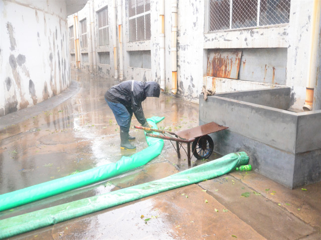 8月10日,臺風(fēng)帶來的強(qiáng)降水洶洶而至。公司黨委書記、董事長王力民到公司各處巡查督導(dǎo),防汛應(yīng)急小組成員各就各位,各部門按職能分工,全力以赴投入到鏖戰(zhàn)“利奇馬”這場硬仗當(dāng)中。為了防止雨水進(jìn)入生產(chǎn)車間,各車間在提前安裝好防水擋板、壘砌防汛沙袋基礎(chǔ)上,每個出入口都安排專人看護(hù),對出現(xiàn)漏水、漏電等情況及時采取措施。在生產(chǎn)現(xiàn)場,相關(guān)設(shè)備人員及時檢查電源柜、防汛泵等設(shè)備,保障正常運(yùn)行;提前增加的安全照明裝置,有效增強(qiáng)了臺風(fēng)期間的現(xiàn)場亮度。針對室外積水積水較深這一情況,開啟防汛泵,將積水排入雨水管道,對積水超過100㎜后安插警示標(biāo)識,并且擺放防汛凳,保障員工安全出入;對外圍排水口及下水管道及時沖洗、清理,以避免廠區(qū)積水影響到生產(chǎn)運(yùn)行。