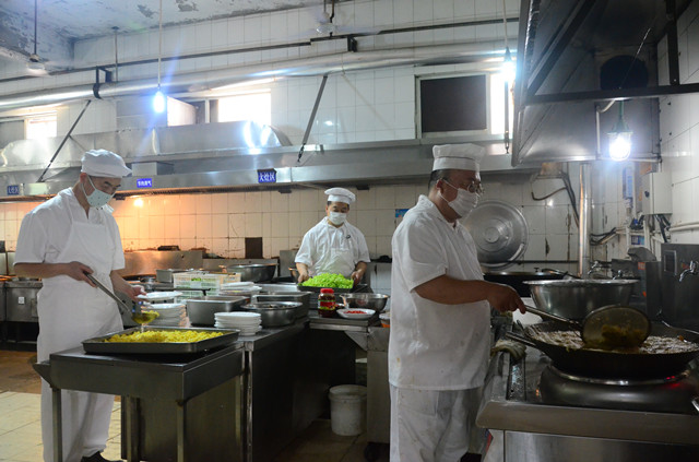 圖為職工食堂工作人員在為生產(chǎn)車間員工準備工作餐和分發(fā)粽子的情形。