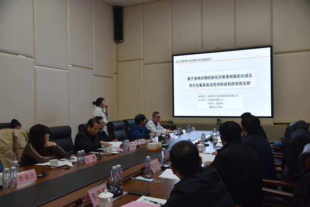 1月14日,山東省重點研發(fā)計劃(公益類)項目“基于廢棉織物的胺化纖維素樹脂的合成及其對含氟表面活性劑和染料的有效去除”項目驗收會議在公司舉行,驗收會由山東紡織工程學會教授韓光亭主持。
