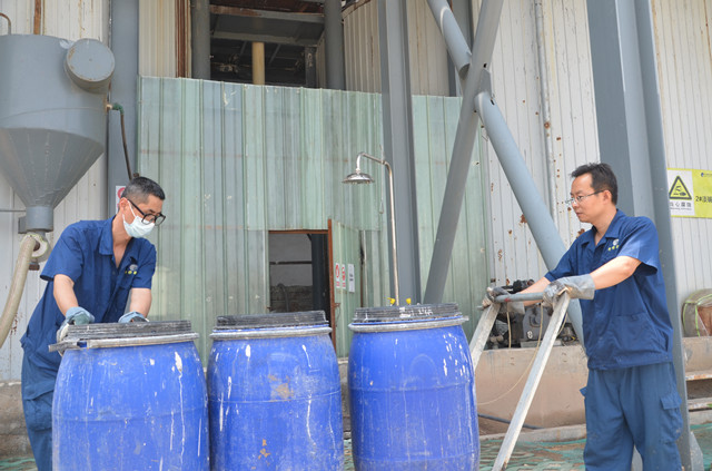 員工正在將機臺回收的花毛,運送至水處理