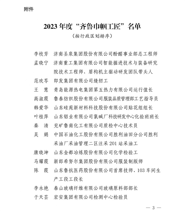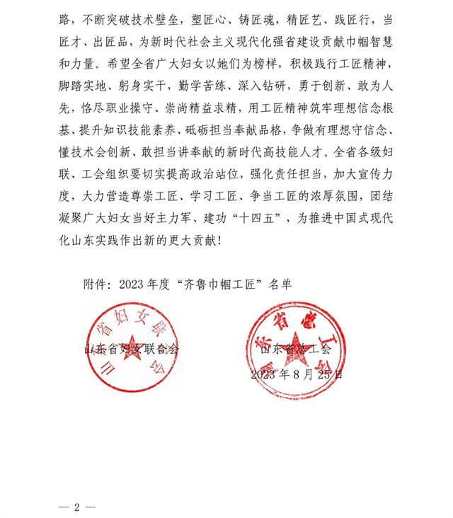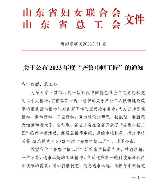導(dǎo)讀:近日,山東省婦女聯(lián)合會、山東省總工會發(fā)布了“關(guān)于公布2023年度‘齊魯巾幗工匠’的通知”,公司染化料配制工郭冬梅名列其中。