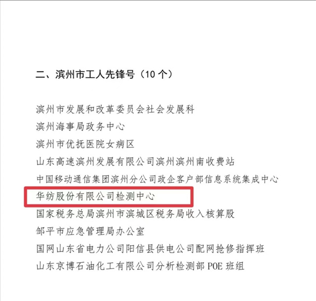 近日,濱州市總工會印發(fā)“關(guān)于濱州市五一勞動獎章和濱州市工人先鋒號的通報”,對華紡股份有限公司檢測中心等“濱州市十佳建功立業(yè)標兵崗”的集體,授予“濱州市工人先鋒號”榮譽稱號。