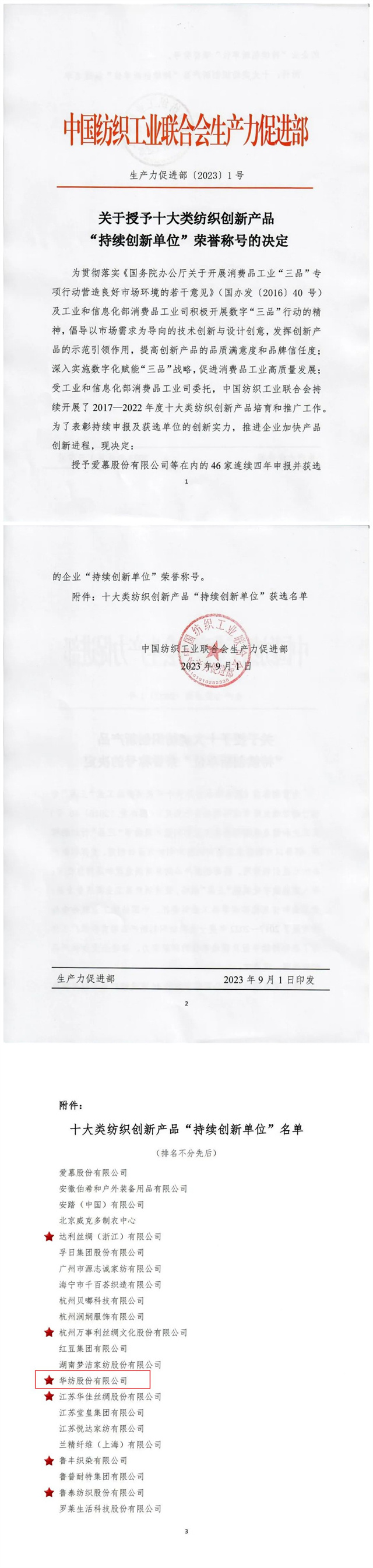 為表彰持續(xù)申報及獲選單位的創(chuàng)新實力,推進企業(yè)加快產(chǎn)品創(chuàng)新進程。近日,中國紡織工業(yè)聯(lián)合會生產(chǎn)力促進部發(fā)布“關于十大類紡織創(chuàng)新產(chǎn)品‘持續(xù)創(chuàng)新單位’榮譽稱號的決定”,授予華紡股份有限公司等在內的46家連續(xù)四年申報并獲選的企業(yè)“持續(xù)創(chuàng)新單位”榮譽稱號。