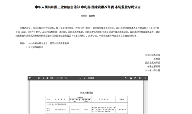 導(dǎo)讀:日前,國家工信部、水利部、發(fā)展改革委、市場監(jiān)管總局等四部門聯(lián)合公示了“2024年重點(diǎn)用水企業(yè)、園區(qū)水效領(lǐng)跑者名單”,公司成功入選國家級(jí)重點(diǎn)企業(yè)水效領(lǐng)跑者
