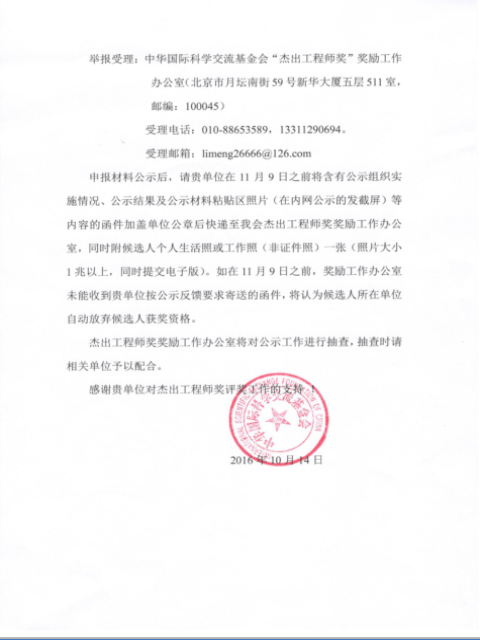 舉報(bào)受理:中國(guó)國(guó)際科學(xué)交流基金會(huì)“杰出工程師獎(jiǎng)”獎(jiǎng)勵(lì)工作辦公室(北京市月壇南街59號(hào)新華大廈五層511室,郵編:100045)