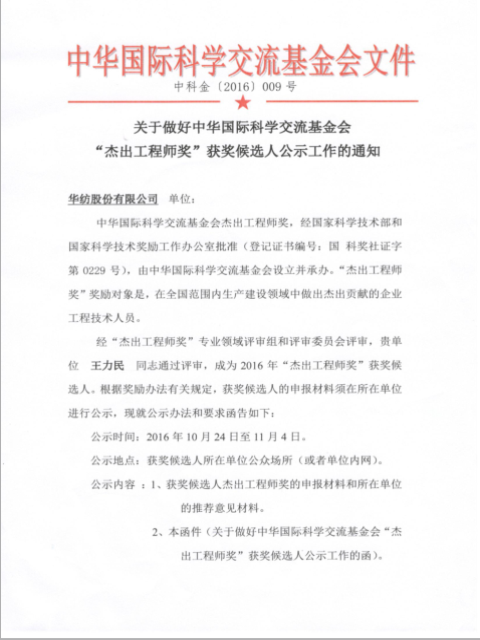 經(jīng)“杰出工程師獎(jiǎng)”專(zhuān)業(yè)領(lǐng)域評(píng)審組和評(píng)審委員會(huì)評(píng)審,華紡股份有限公司王力民同志通過(guò)評(píng)審,成為2016年“杰出工程師獎(jiǎng)”獲獎(jiǎng)候選人。根據(jù)獎(jiǎng)勵(lì)辦法有關(guān)規(guī)定,獲獎(jiǎng)候選人的申報(bào)材料需所在單位進(jìn)行公示。公示如下: