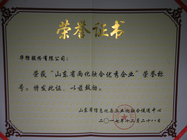 2017年12月28日,山東省信息化與工業(yè)化融合促進(jìn)中心公開(kāi)表彰了“山東省兩化融合優(yōu)秀企業(yè)”,公司以近年來(lái)在兩化融合方面的卓越表現(xiàn),榮登這一榜單。